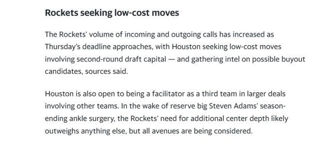 由于亞當斯賽季報銷,補強中鋒位置是火箭隊的迫切需求,此外,休城也愿意作為第三方參與其他球隊的大型交易,目前正在衡量所有可行方案。