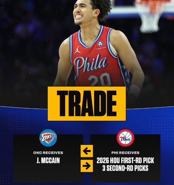 他們先從76人交易得到了賈里德·麥凱恩,為此送出了一個2026年首輪簽和三個次輪簽:2026年首輪簽(來自火箭);2027年次輪簽(雷霆、火箭、步行者和熱火中順位最高的一個);2028年次輪簽(來自雄鹿);2028年次輪簽(來自雷霆)。