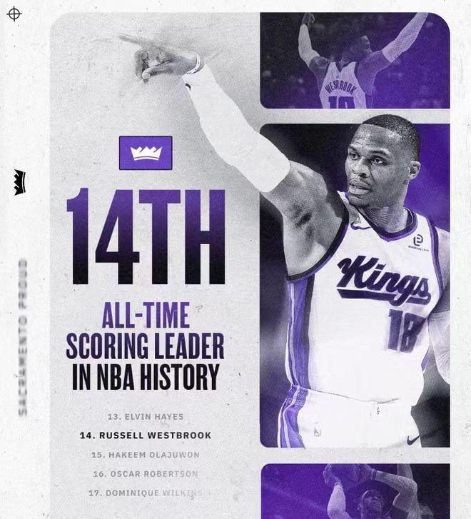 威少常規賽總得分超越火箭名宿奧拉朱旺,升至NBA歷史總得分榜第14位。