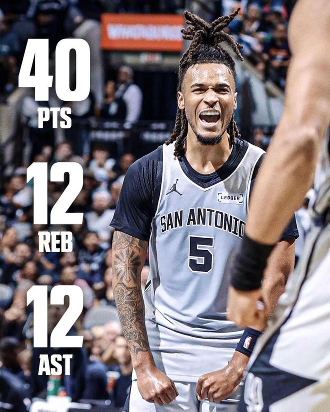 這場比賽,馬刺后衛卡斯爾打出了生涯之夜:全場出戰31分鐘,投籃19中15,三分5中3,罰球10中7,拿下40分12籃板12助攻3搶斷。