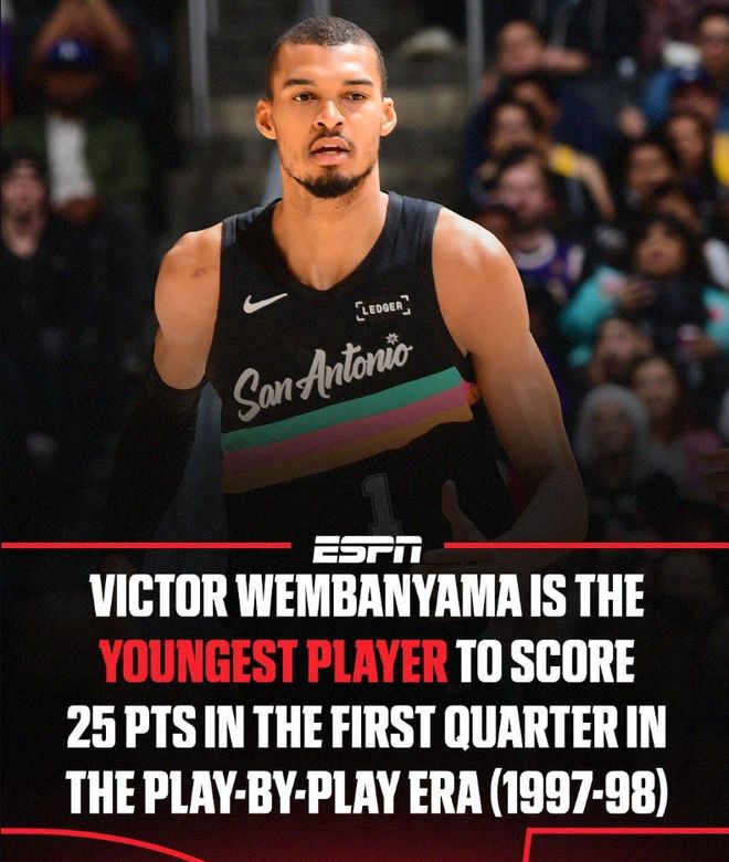 而最讓人驚嘆的,還要當屬圣安東尼奧馬刺隊的最強狀元文班亞馬。就在剛剛結束的客場對陣湖人一戰,文班亞馬在僅僅26分鐘的時間里,20投13中,三分6中4,罰球12中10,狂轟40分12籃板2助攻2搶斷1蓋帽,不單單刷爆了隊史紀錄,更是NBA歷史首位在26分鐘內砍下至少40分12籃板的球員,一戰封神!