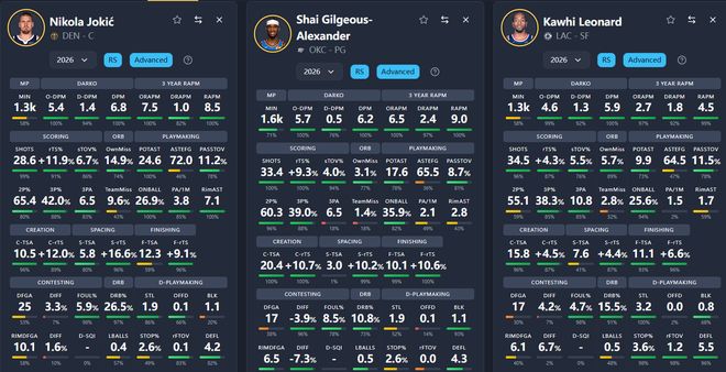 通過DPM值,不難發(fā)現(xiàn),這五位球員就是如今聯(lián)盟里的最強(qiáng)的5位個(gè)體。五人中,SGA代表的是極致的進(jìn)攻,他進(jìn)攻的O-DPM值高達(dá)5.7,而文班亞馬則代表極致的防守,他的D-DPM值高達(dá)2.8,是五人中唯一一位比代表進(jìn)攻貢獻(xiàn)值O-DPM值還高的一位。萊昂納德是五人中最為均衡的,他的O-DPM值為4.6,D-DPM值為1.3,是五人中兩項(xiàng)數(shù)據(jù)差值最小的一位。
