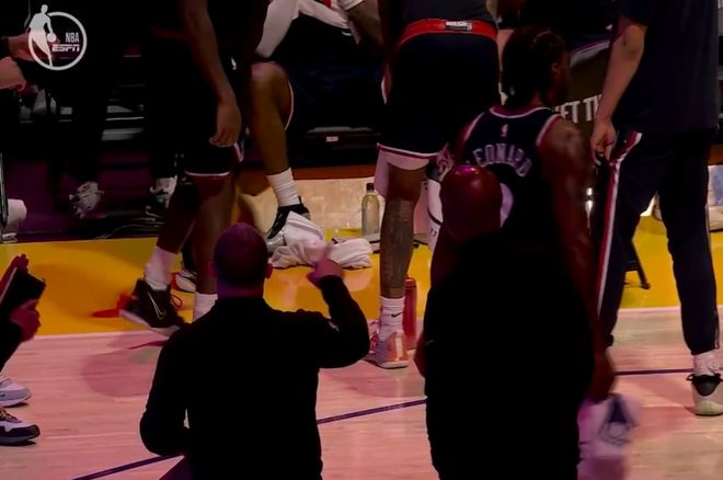 小卡與泰倫盧聊了幾句后,快船記者報道,小卡因為左腳踝酸痛本場不會回歸。