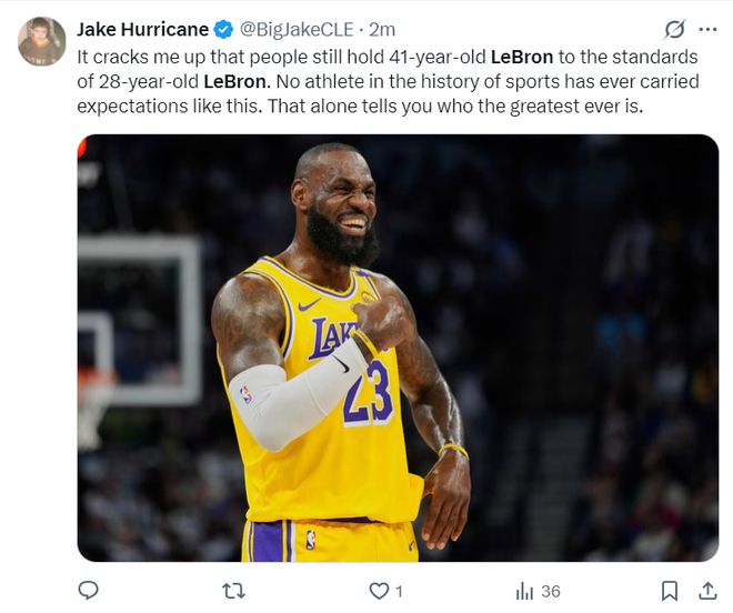 半場打完美記Jake Hurricane寫道:人們居然在用41歲的勒布朗與28歲的勒布朗作比較,這讓我忍俊不禁。在體育史上沒有哪一位運動員受過如此之高的期望,單憑這一點足以說明他是歷史最偉大的球員。