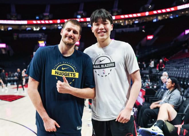 本場比賽賽前,開拓者新秀楊瀚森與自己的偶像——掘金球星約基奇進行了交流互動,并合影留念。