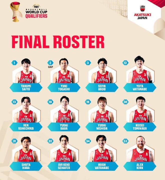 作為對手,日本男籃也是公布了他們的12人名單,最值得關注的就是他們的歸化中鋒使用了年紀更大、實力更弱的柯克,沒有用更年輕也更厲害的霍金森。