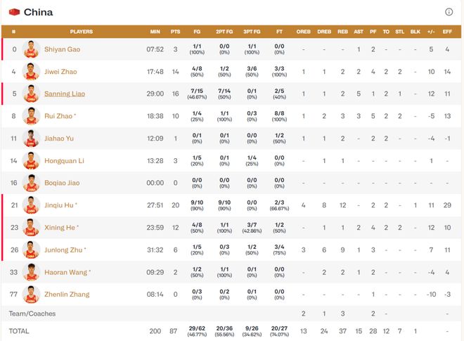中國(guó)隊(duì)陣中五人得分上雙,充分展示了雄厚的整體實(shí)力。胡金秋20分12籃板兩雙,廖三寧16分,趙繼偉14分,賀希寧12分,趙睿10分。日本隊(duì)則由渡邊雄太拿下13分,富永啟生14分,歸化球員科克12分,西田優(yōu)大14分。