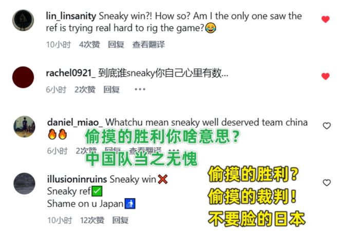 可以看到網(wǎng)友們的回復(fù)直接:“這是偷來(lái)的勝利嗎?我只看到了這是一個(gè)真正的勝利。”后面網(wǎng)友評(píng)論:“中國(guó)隊(duì)贏的問(wèn)心無(wú)愧。”、“偷來(lái)的勝利?不,偷來(lái)的裁判!”、“日本隊(duì)不要臉面,到底誰(shuí)才是小偷,你自己心里清楚。”、“看過(guò)這場(chǎng)比賽都知道,中國(guó)隊(duì)從日本和裁判手里搶走了勝利,這才符合實(shí)際情況。”、“你們安排了三個(gè)裁判,8打5都打不過(guò),所以才氣急敗壞了嗎?”