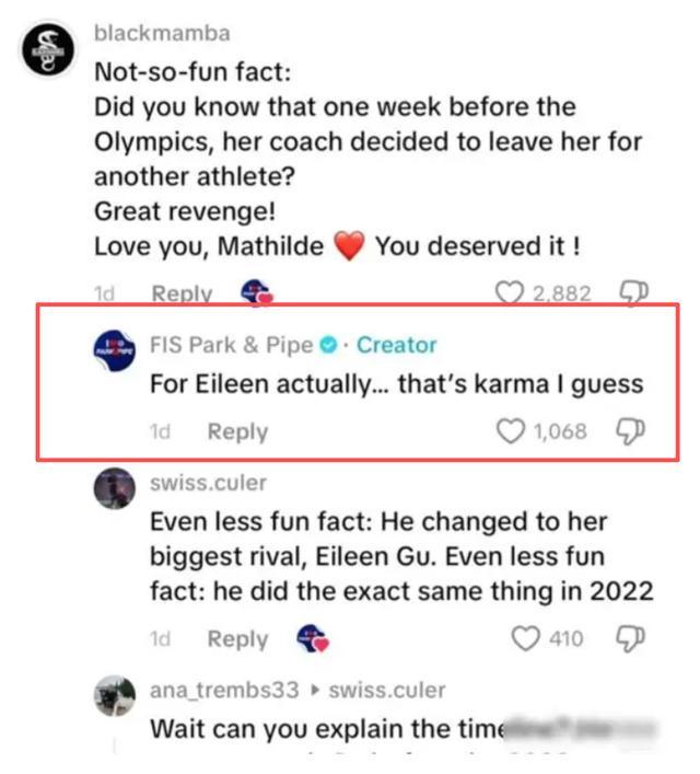 冬奧會期間,國際滑雪和單板滑雪聯(lián)合會(FIS)也踩過同樣的“雷”。FIS旗下官方TikTok賬號“FIS Park & Pipe”在一條關(guān)于瑞士選手瑪?shù)贍柕隆じ窭啄聤Z得女子坡面障礙技巧金牌的視頻評論區(qū),先有網(wǎng)友拋出所謂“不那么有趣的事實”,聲稱格雷莫德的教練在冬奧前一周“離開她去帶另一名運動員”,并把奪金形容為“復(fù)仇”“是你應(yīng)得的”。該官方賬號隨后竟跟評稱:“對谷愛凌而言……我猜這就是所謂的‘因果報應(yīng)’。”把谷愛凌未能奪金輕飄飄地歸因為“karma”(常被理解為“現(xiàn)世報”)。事件引發(fā)外界強(qiáng)烈不滿后,相關(guān)評論被刪除;據(jù)報道,F(xiàn)IS也就此致歉。