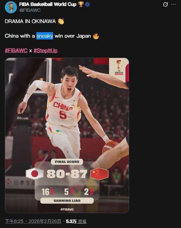 起因是中國男籃在客場87-80擊敗日本男籃賽后,FIBA竟然說中國男籃“偷走”了勝利致使評論區翻車,隨后他們將文案改為“中國男籃在下半場翻盤,拿走了勝利。”