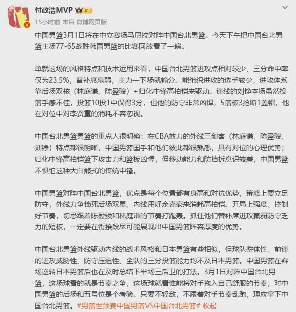 中國(guó)臺(tái)北相比中國(guó)男籃最大劣勢(shì)在于替補(bǔ)與首發(fā)實(shí)力差距過(guò)大,基本上沒有能打的球員,但凡能夠鎖死陳盈駿+林庭謙兩個(gè)CBA出品的全明星后衛(wèi)就事半功倍。
