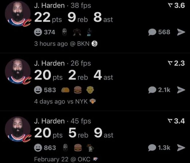 哈登(36歲188天)連續三場比賽得分20+,創騎士隊史最老紀錄。