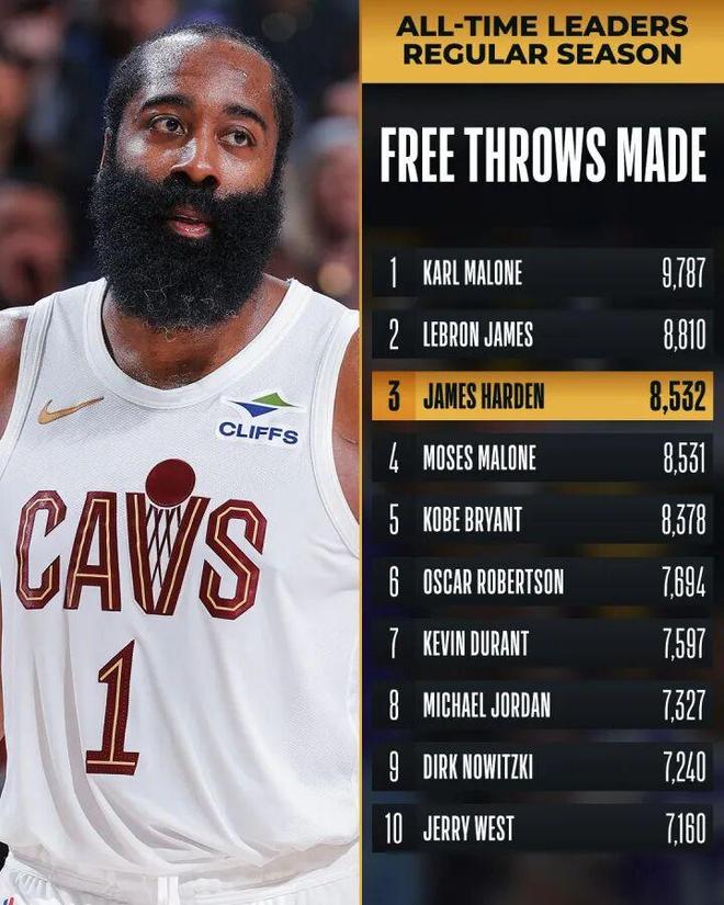 今天過后,哈登生涯總罰球命中數來到8535個,超越摩西·馬龍(8531個)升至歷史第3,距離第2的詹姆斯還有278個。