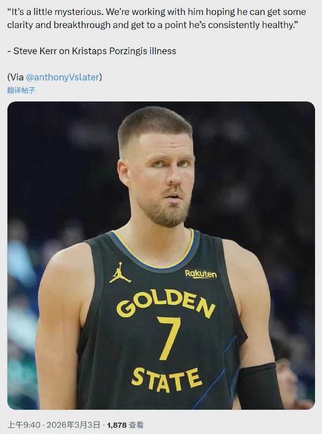 言歸正傳,其實本場比賽主角為沒有上場的“鉑金”波爾津吉斯......這哥們是真離譜,為勇士打了一場比賽之后,就消失了。