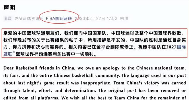 迫于強大輿論壓力,FIBA于2月27日緊急發布中英文雙語致歉聲明,承認用語嚴重失當,肯定中國隊技戰術表現與頑強意志,并悄然撤下原帖、替換為修正后文案。