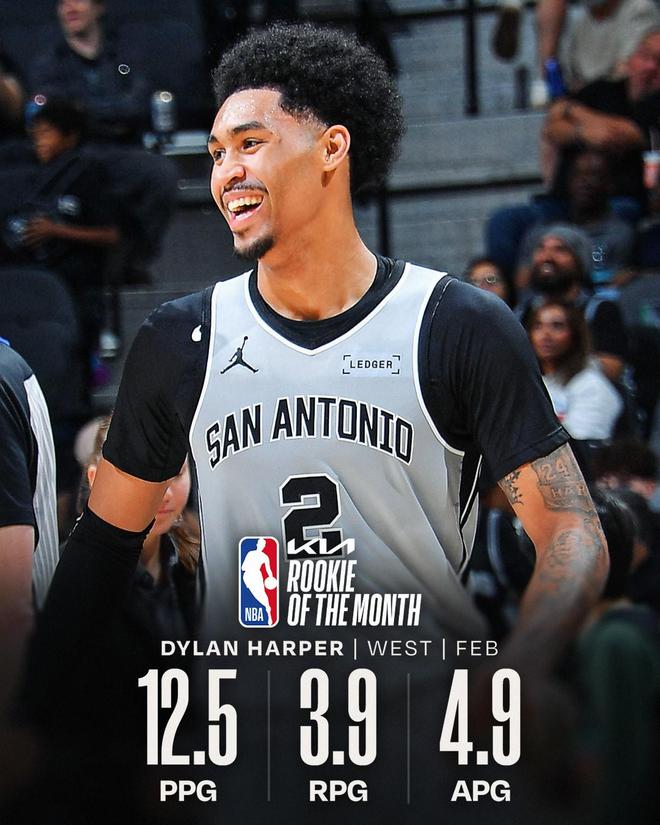 馬刺在2月則取得了11戰全勝的完美戰績,其中迪倫-哈珀場均貢獻12.5分3.9籃板4.9助攻,最終他也被評為了NBA2月西部最佳新秀。