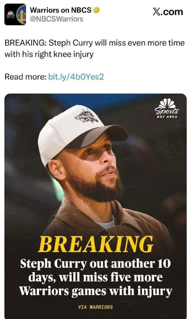 前幾天,勇士官宣, 庫里因右膝傷勢將再休戰10天,這將至少再缺席5場比賽。