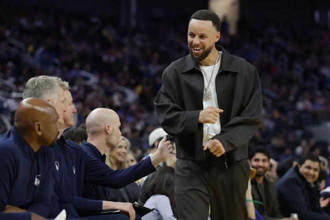全明星前勇士對湖人的比賽中,庫里幾乎整場都站在替補席為隊友加油。