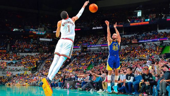 灰熊前鋒上籃到一半,被直接攔下。