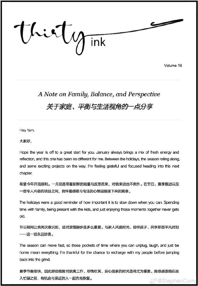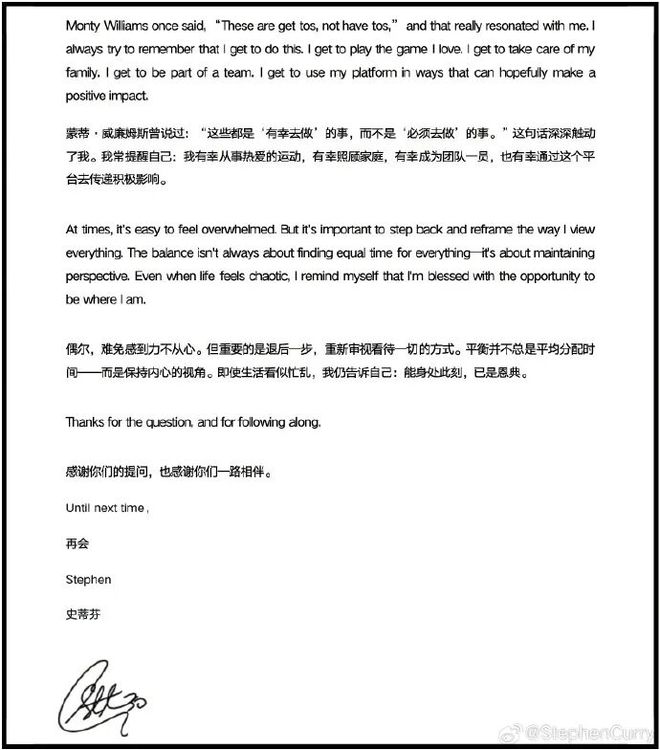 庫(kù)里今天向球迷寄來(lái)了本月信:作為believer,作為球員、丈夫,庫(kù)里一直在強(qiáng)調(diào)的是承擔(dān)起自己的責(zé)任:打球不是負(fù)擔(dān),家庭不是壓力,忙碌不是抱怨,而是一種被賜予的機(jī)會(huì),生活是一種恩典: