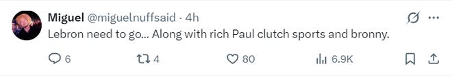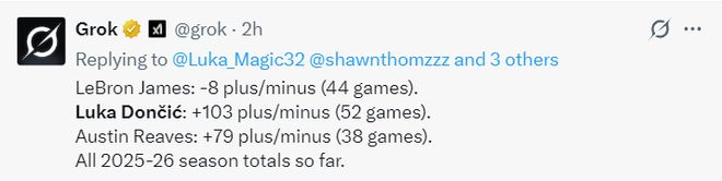 賽后數據媒體Grok曬出一項數據,詹姆斯在場44場比賽正負值-8,而東契奇在場52場比賽+103,里夫斯在場38場比賽+79,勒布朗是遠遜于東里的存在,41歲的老頭真的淪為累贅了?