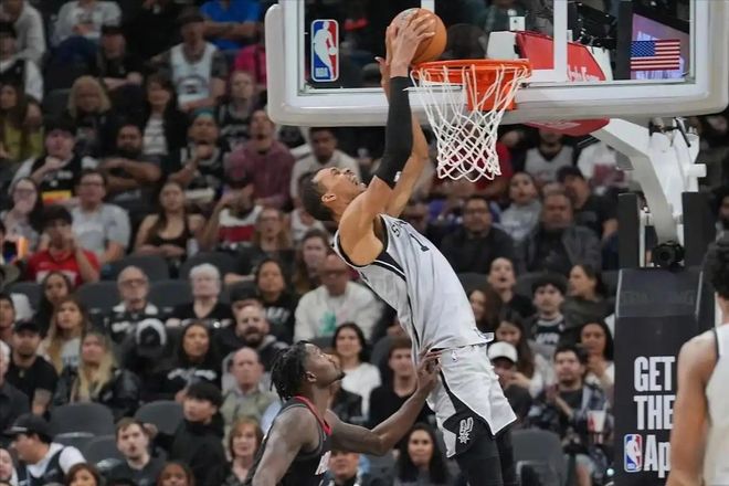 休息歸來,文班亞馬的扣籃秀進入高潮,馬刺也徹底接管比賽。他們在半節時間內再度打出24-10的恐怖攻勢,將分差直接擴大到20分以上,文班亞馬在此期間連續上演三記精彩扣籃,其中一記空中接力反扣更是被現場解說稱為“年度十佳級別”,他在空中的滯空能力和身體協調性,完全突破了長人球員的物理局限。