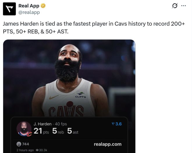 這是哈登加盟騎士隊以來火爆狀態的縮影,本場比賽結束后,哈登加盟騎士以來總數據來到212分55板86助,僅花費11場比賽就達成200+50+50追平騎士隊史最快紀錄。