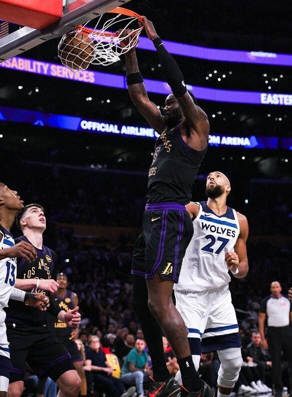 第三節森林狼隊陷入運動戰得分荒,整個前6分鐘在運動戰一分未得,僅靠罰球拿到了7分。湖人隊方面東契奇、里夫斯和拉拉維亞等接連得分,雙方分差被拉開到兩位數。三節比賽結束之時,湖人隊84-68領先森林狼16分。