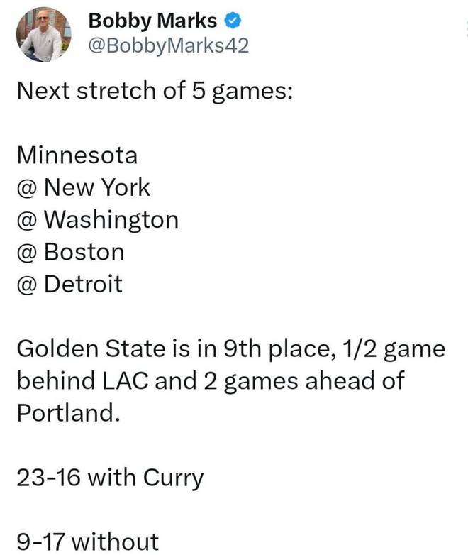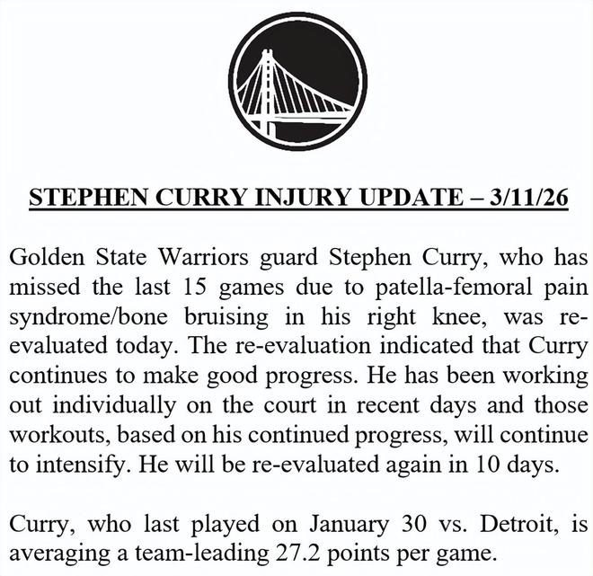 但庫里本人也稱這次右膝傷勢“難以預料”。自1月25日在明尼阿波利斯一次個人訓練中首次出現傷勢后,他已經遭遇過反復。他原本希望在全明星賽后立刻復出,但因膝蓋恢復未達預期,不得不降低訓練強度。本賽季庫里出戰時勇士戰績為23勝16負,而缺少這位頭號得分手時,球隊僅9勝17負。