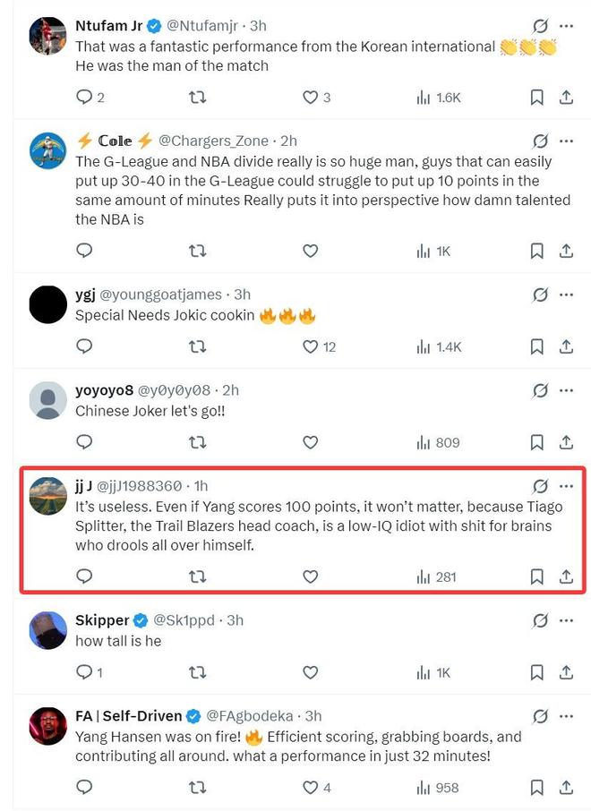 但有一位開拓者球迷寫道:沒用的,就算楊瀚森在G聯賽拿到100分也沒用,因為開拓者主帥斯普利特是一個低智商、愚蠢的主帥,他不會給楊瀚森機會的。
