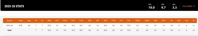 實際上這場比賽后,楊瀚森在G聯賽場均29.4分鐘,拿到19.3分9.7籃板3.3助攻0.9搶斷1.2蓋帽,命中率66.7%,三分命中率36.4%,這個數據真的不差。