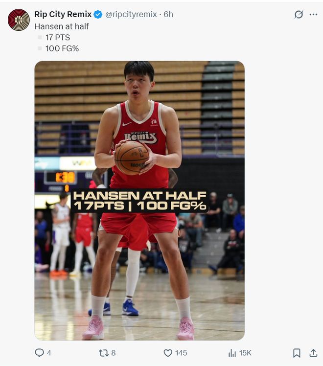 這場比賽中國球員楊瀚森的發揮也很出色,他在首節5分鐘里4中4拿到9分,各種籃下的勾手十分精準,次節4中4拿到8分,上半場楊瀚森彈無虛發8中8拿到17分,混音官方都為他點贊。