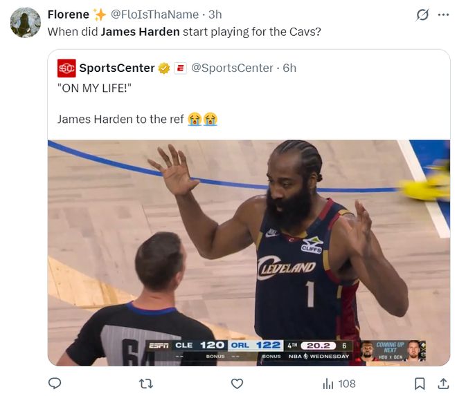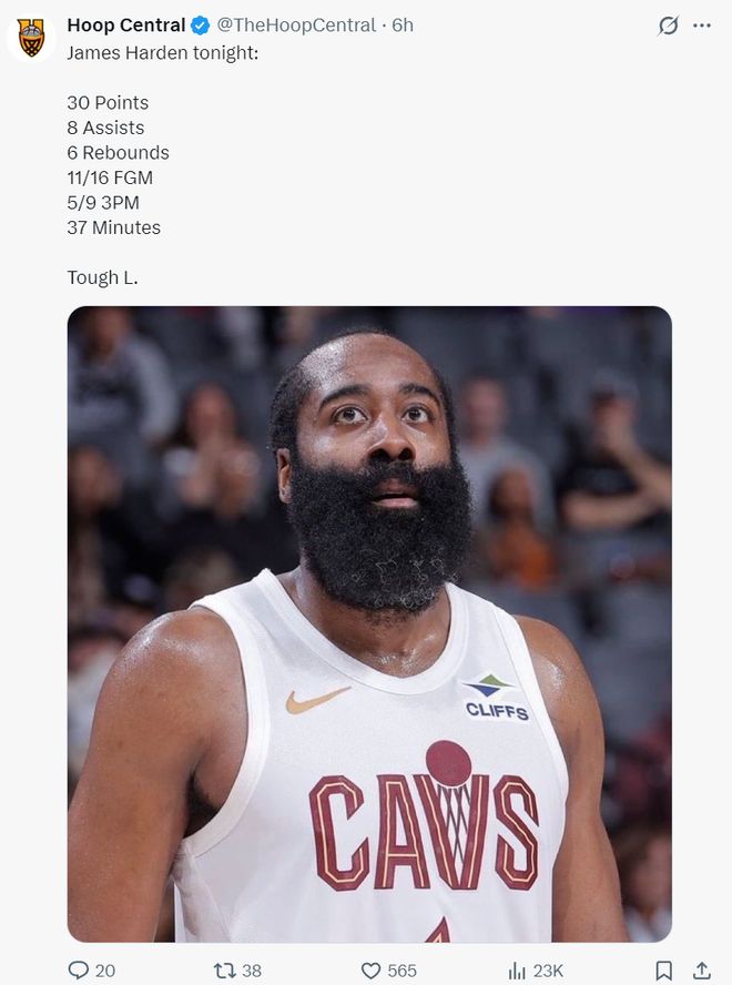 賽后這場比賽哈登拿到30+輸球了,但他登場的比賽騎士9勝3負依舊出色,這位36歲的老將依舊存在聯盟頂級戰力。