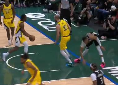 字母哥是在一次突破扣籃以后的落地時受傷的,他當時迎著赫夫的防守完成隔扣,但是落地時有崴腳的情況出現,并且他的左膝過度伸展。隨后字母哥回到更衣室,沒有出戰末節的比賽。
