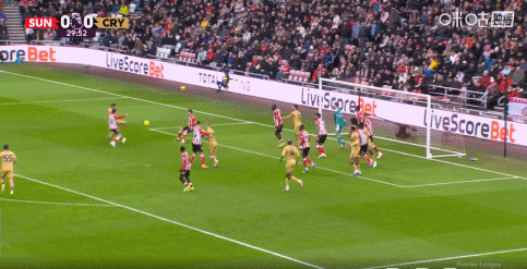 第33分鐘,迅速扳平,勒費埃禁區迎球推射破門,桑德蘭1-1