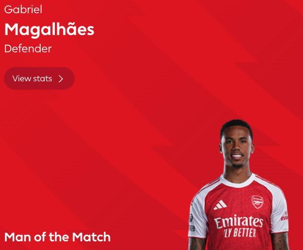 最終經過英超官網球迷投票,加布里埃爾以39%的得票率當選全場最佳球員。