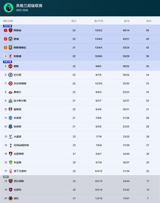 英超第22輪繼續(xù)進(jìn)行,多支球隊(duì)完成了自己的第22輪比賽。英超積分榜排名前兩位的阿森納和曼城分別取得一平一負(fù)的戰(zhàn)績(jī)。其中,阿森納客場(chǎng)0-0戰(zhàn)平諾丁漢森林,曼市德比曼聯(lián)2-0復(fù)仇曼城,最終,阿森納以7分優(yōu)勢(shì)領(lǐng)跑英超積分榜。