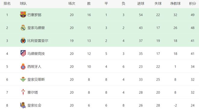 在積分榜上,輸球的巴薩依然排名榜首。巴薩的戰績是16勝1平3負,拿到49分。皇馬的劣勢已經變得很小了,總積分是48分,只落后巴薩1分排名第2。皇馬最快下一輪有希望超越巴薩登頂,當然,前提就是巴薩再次丟分。比利亞雷亞爾拿到41分,排名第3。贏球的馬競總積分也是41分,排名第4。西班牙人34分排名第5。