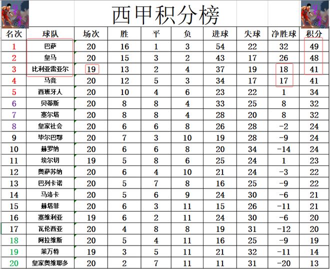 積分榜方面,巴薩11連勝被終止后,下半程剛開始,他們就被皇馬將分差縮小到了1分,兩隊的爭冠懸念還是很大。比利亞雷亞爾本輪輸球,無力再往前追皇馬,而且今天馬競今天贏球后追了上來,比利亞雷亞爾僅憑1個凈勝球守住第3。
