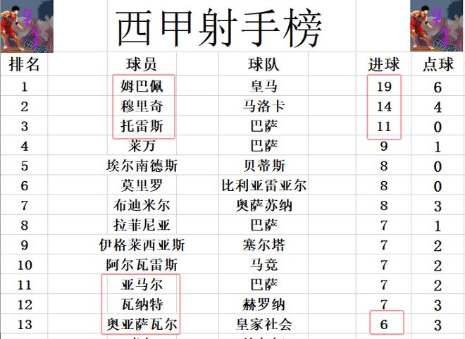 射手榜方面,姆巴佩19球領跑,穆里奇14球緊隨其后,托雷斯今天首發未能進球,還是11球排在第3。萊萬替補登場同樣沒有進球,9球排在第4。奧亞薩瓦爾打入一球,還差1球才能擠入前十。