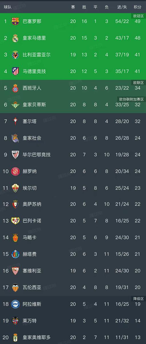 京時間1月19日,西甲除了埃爾切和塞維利亞的比賽還沒有進(jìn)行,已經(jīng)結(jié)束了9場比賽,我們看看最新積分榜變動!