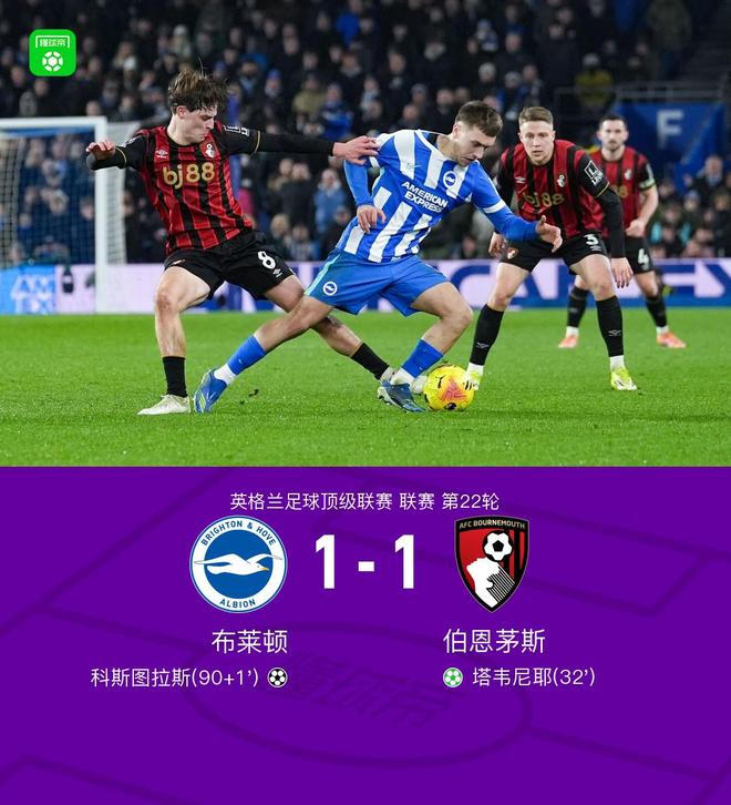北京時(shí)間1月20日英格蘭足球頂級(jí)聯(lián)賽 聯(lián)賽 第22輪,布萊頓主場(chǎng)對(duì)陣伯恩茅斯。上半場(chǎng),阿德利造點(diǎn),塔韋尼耶主罰命中。下半場(chǎng)最后時(shí)刻,范黑克助攻,科斯圖拉斯倒鉤絕平。全場(chǎng)比賽結(jié)束,布萊頓1-1伯恩茅斯。