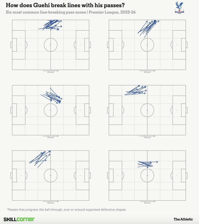 在水晶宮,格伊經(jīng)常出現(xiàn)在三中衛(wèi)體系中的左中衛(wèi)位置。他的很多向前傳球,都會(huì)分到邊路,讓米切爾在翼衛(wèi)位置上拉開(kāi)空間。不過(guò),隨著他在面對(duì)陣地防守時(shí)獲得更多觸球機(jī)會(huì),我們已經(jīng)看到他在“穿透性向前傳球”方面具備進(jìn)一步提升的潛力——他完全有能力用雙腳在中路關(guān)鍵區(qū)域找到隊(duì)友。