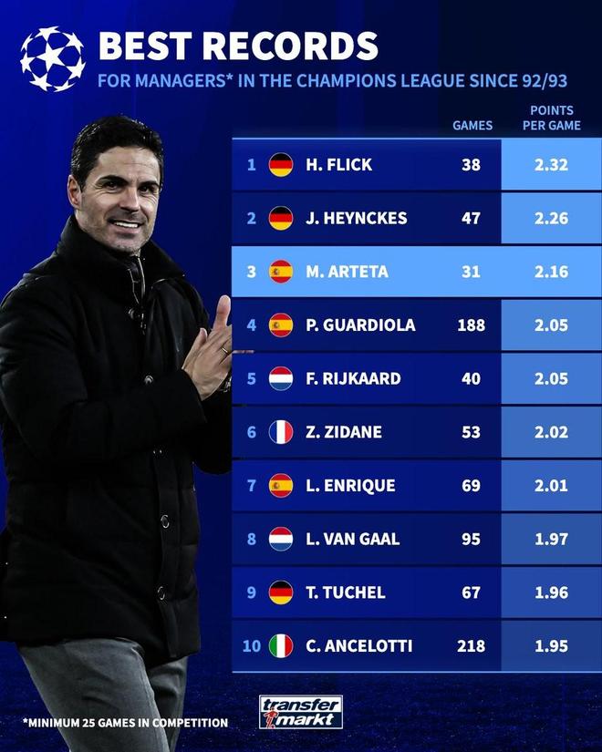 歐冠聯賽階段第7輪,阿森納客場3-1擊敗國米。據德國轉會市場網站統計,在執教歐冠至少25場的主帥中,阿爾特塔場均積分僅次于弗里克和海因克斯。