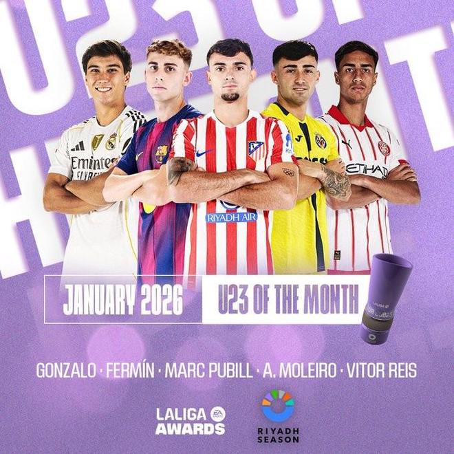 北京時間1月22日,西甲1月最佳U23球員候選名單公布,這5名球員為貢薩洛-加西亞、費爾明-洛佩斯、普維爾、莫萊羅、維托爾-雷斯。