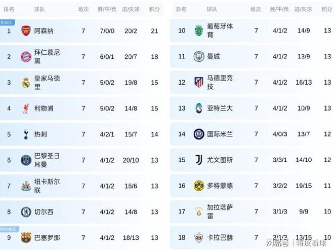 不難看出,如果只計算積分的話,英超6支球隊都擠進前八名,整體強勢可見一斑。除了英超6隊之外,能夠拿到13分的,只有“皇薩仁”三強,衛冕冠軍巴黎圣日耳曼,加上葡萄牙體育、馬德里競技和亞特蘭大,“合圍”英超之勢已經確立。