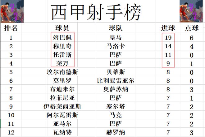 射手榜方面,姆巴佩19球繼續領跑,穆里奇5球之差位列第2。托雷斯11球第3,萊萬9球排在第4。亞馬爾,阿爾瓦雷斯,拉菲尼亞等人7球剛好擠入前十。