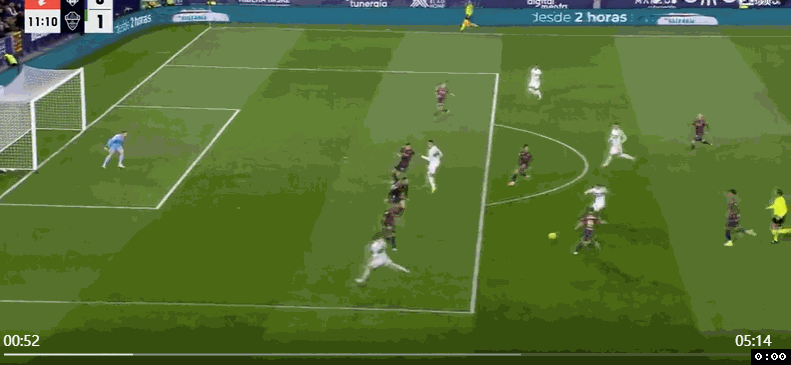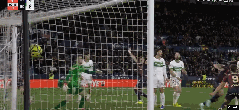 之后兩隊一頓悶戰,直到尾聲階段再迎來高潮,第82分鐘,埃爾切左路快速反擊,瓦萊拉突到禁區邊上兜傳禁區中路,曼特孔點球點右側搶點頭球擺渡做球,博亞爾搶到第2落點凌空倒掛金鉤,皮球應聲入網,埃爾切2:2扳平比分。然而埃爾切并未能搶到1分,補時最后1分鐘,萊萬特右側角球機會,奧拉薩加斯蒂操刀主罰兜傳門前,馬圖羅人群中高高躍起搶點強力頭槌攻門,皮球直入網窩,萊萬特3:2壓哨絕殺埃爾切。