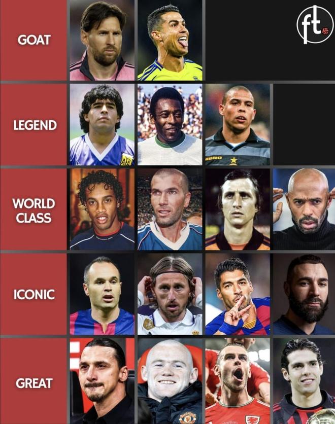 最底一檔的沖突更大:貝爾的歐冠次數很高,而且關鍵場的存在感也很強,按這張圖強調硬榮譽的邏輯,他至少不該落到最底層;伊布則是典型的“能力和聯賽統治力極強,但在歐冠和世界杯這種硬冠上短板明顯”,放在最底層反而更符合這張圖的取向。整體結論就是:頂層和傳奇層基本穩,中間兩層的錯位主要體現在克魯伊夫偏低、本澤馬和莫德里奇偏低、貝爾偏低,而亨利和蘇亞雷斯更容易被拿來質疑位置。