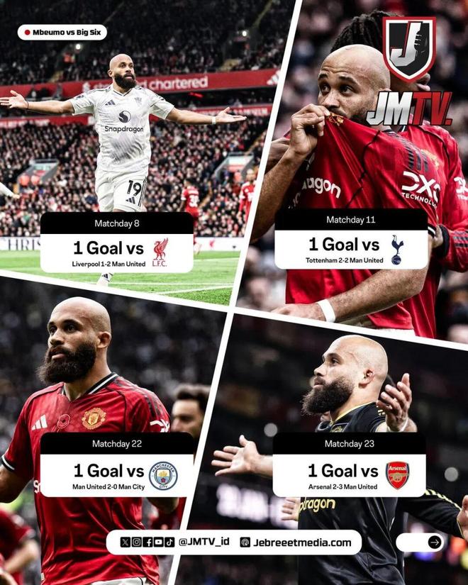 去年夏天, 曼聯花費7500萬歐元引進姆伯莫。他雖因非洲杯缺席了多場比賽,但在18次英超出場中交出了8球1助的數據。據統計,姆伯莫成為了自2022-23賽季的拉什福德以來,曼聯首位在英超單賽季面對阿森納、曼城以及利物浦全都取得進球的球員。此外,他還是自2012-13賽季的范佩西以來,曼聯首位在加盟球隊的首個賽季就能夠在英超聯賽中連續攻破阿森納、曼城以及利物浦球門的球員。